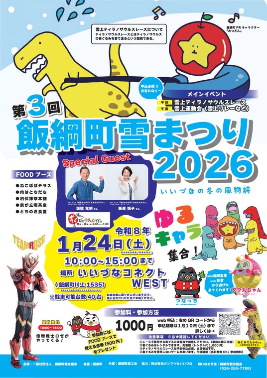 長野県飯綱町では、「飯綱町雪まつり2026」の目玉イベントとして、今年も話題沸騰のティラノサウルスレースを1月24日(土)に開催します。