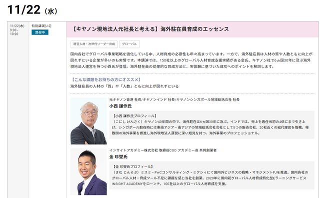150社以上のグローバル人材育成支援実績がある金氏と、キヤノン社で6ヵ国30年に及ぶ海外現地法人運営の経験を持つ小西氏が、海外駐在員の効果的な育成方法と、実体験に基づいた成功へのポイントを解説!