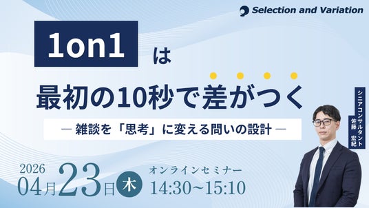 組織・人事コンサルティングファームであるセレクションアンドバリエーション株式会社(以下、当社、東京都千代田区丸の内、大阪市西区、名古屋市西区 / 代表取締役社長:平康慶浩/ URL:https://sele-vari.co.jp/ )は『1on1は最初の10秒で差がつく ― 雑談を「思考」に変える問いの設計 ―』セミナーを2026年4月23日(木)14:30~15:10に開催することをお知らせいたします。