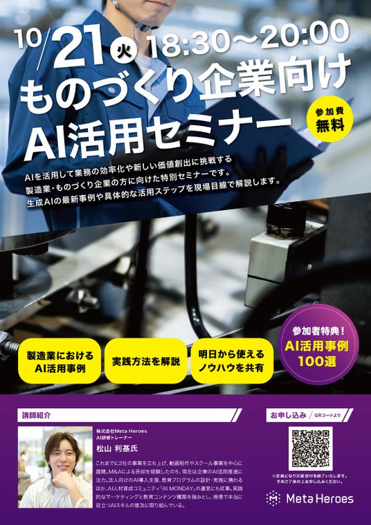 株式会社Meta Heroes(本社所在地:大阪府大阪市、代表取締役:松石和俊、以下「当社」)は、2025年10月21日にウェビナー形式で実施した「ものづくり企業向けAI活用セミナー」の開催レポートおよび参加者アンケート結果を公開します。