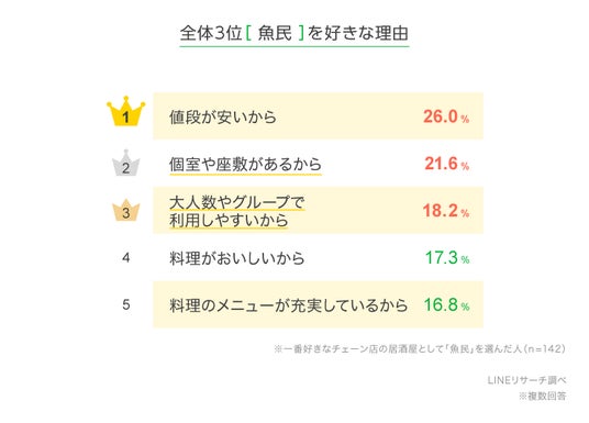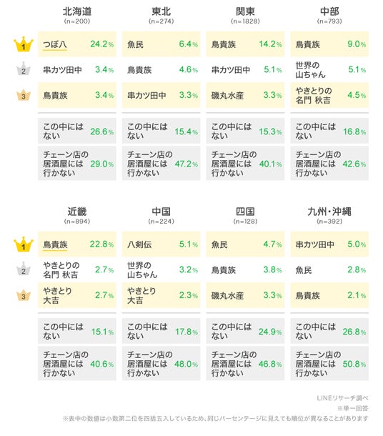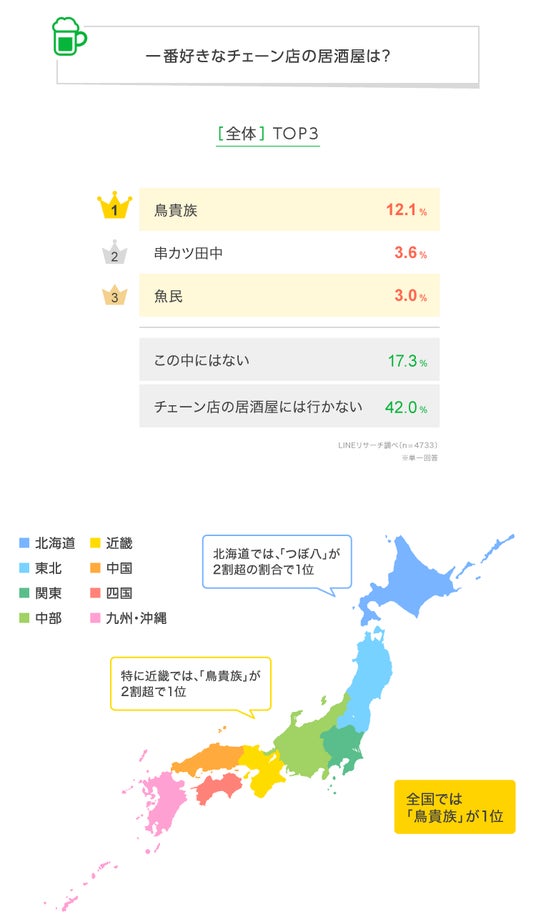 LINEリサーチ、全国の男女を対象に、一番好きなチェーン店の居酒屋に関する調査を実施