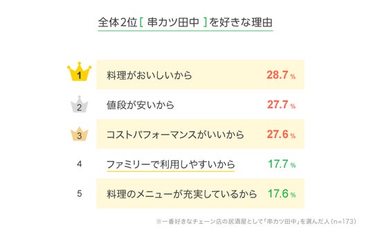 全国2位の「串カツ田中」を好きな理由としては、「料理がおいしいから」が2割台後半で1位となりました。2位「値段が安いから」、3位「コストパフォーマンスがいいから」も1位と僅差で続きます。4位の「ファミリーで利用しやすいから」は、上位のチェーン店の居酒屋と比べて高い割合となっていました。