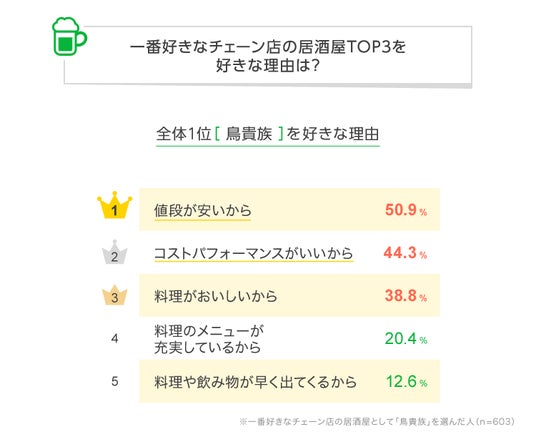 全国1位の「鳥貴族」を好きな理由をみると、「値段が安いから」と「コストパフォーマンスがいいから」がそれぞれ4~5割台で上位の理由となり、上位のチェーン店の居酒屋と比べて高い割合です。