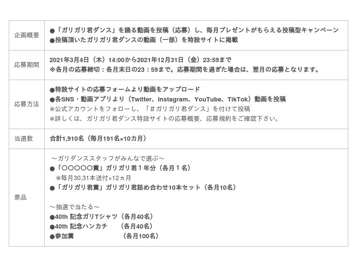 ガリガリ君は1981年に発売を開始し、皆さまに愛され続け、2021年に40周年を迎えることができました。40周年では、ガリガリ君ダンス動画投稿キャンペーンや今までに発売してこなかった新フレーバーの開発をはじめ、様々な企画に挑戦してまいります。
