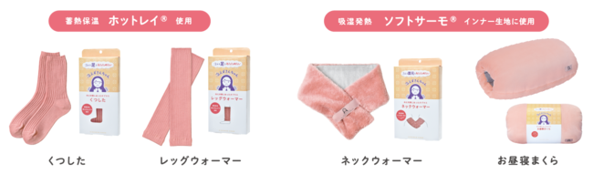 蓄熱保温ホットレイ(R)️*1 や吸湿発熱ソフトサーモ(R)︎*2 など、機能性素材を採用した肌触り柔らかなウェアラブルアイテム。冷えの気になる箇所をやさしく包んで温めます。
