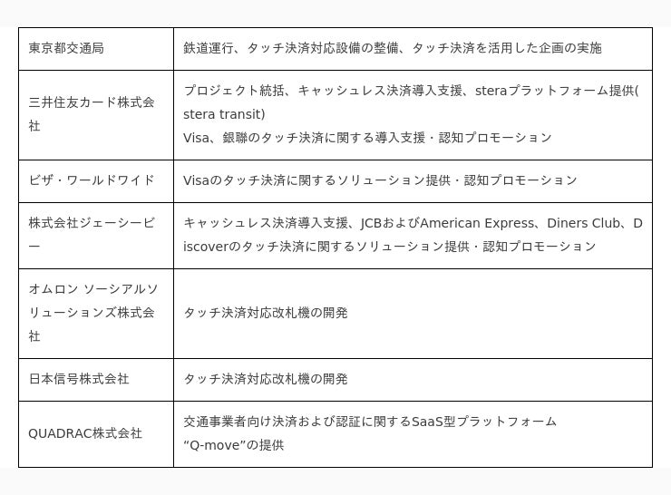 東京都交通局(東京都新宿区、交通局長:久我 英男)、三井住友カード株式会社(本社:東京都江東区、代表取締役社長:大西 幸彦)、ビザ・ワールドワイド・ジャパン株式会社(本社:東京都千代田区、代表取締役社長:シータン・キトニー)、株式会社ジェーシービー(本社:東京都港区、代表取締役執行役員社長:二重 孝好)、オムロン ソーシアルソリューションズ株式会社(本社:東京都港区 代表取締役社長:四方 克弘)、日本信号株式会社(本社:東京都千代田区、代表取締役社長:塚本 英彦)、QUADRAC株式会社(本社:東京都港区、代表取締役社長:高田 昌幸)、は2024年内(予定)に、都営浅草線などにおいて、三井住友カードが提供する公共交通機関向けソリューション「stera transit」を活用した、タッチ決済対応のカード(クレジット、デビット、プリペイド)や、同カードが設定されたスマートフォン等による乗車サービスに関する実証実験を開始します。