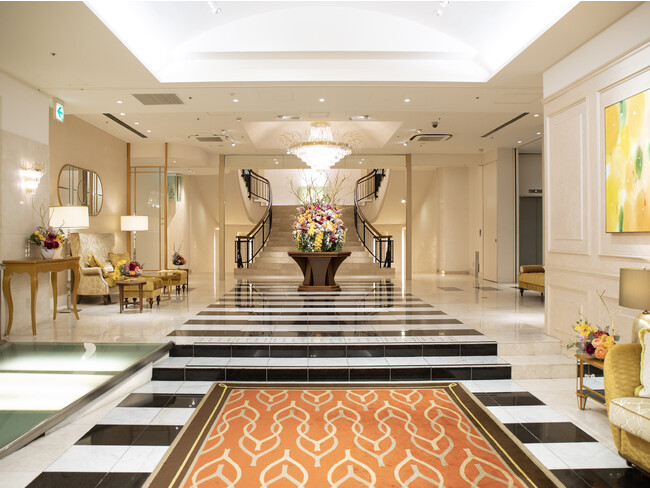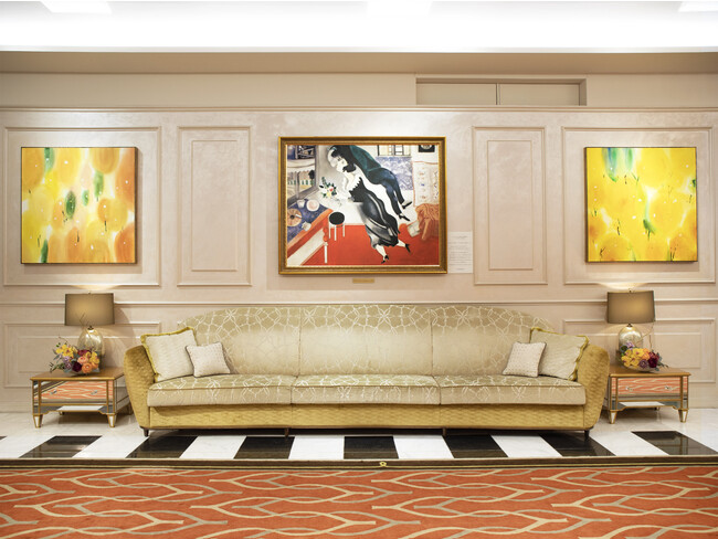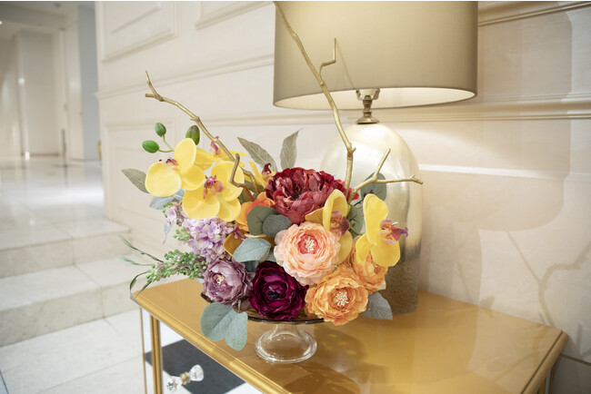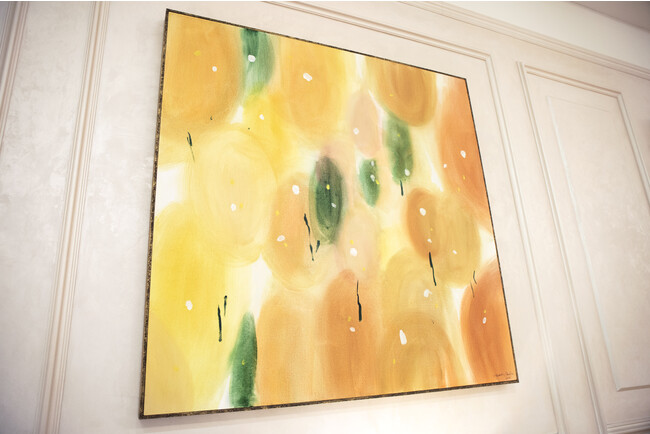 「アニヴェルセル 表参道」は記念日プロデュース事業を通じて、ウェディングをはじめ多くの記念日をお手伝いさせていただき、たくさんの幸福と共に過ごしてまいりました。エントランスの正面に見える象徴的なウェルカムフラワーは、温かみのある色合いを中心に表参道のイルミネーションで美しく光り輝くケヤキや華やぐ街をイメージした芸術的な作品に仕上がりました。ウェルカムフラワーと同じテーマのフラワー作品も複数配置しお客様を華やかにお出迎えしています。「アニヴェルセル」の絵画の横にはイエローカラーベースの絵画を飾り、全体的に秋冬を感じていただけるような空間にいたしました。