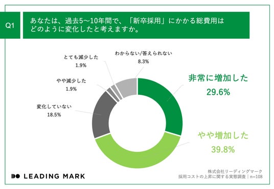 「Q1.あなたは、過去5~10年間で、「新卒採用」にかかる総費用はどのように変化したと考えますか。」(n=108)と質問したところ、「非常に増加した」が29.6%、「やや増加した」が39.8%という回答となりました。