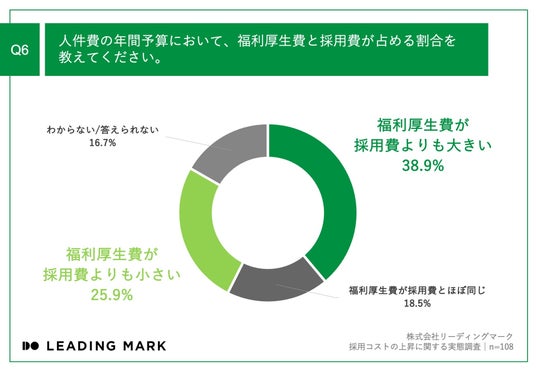 「Q6.人件費の年間予算において、福利厚生費と採用費が占める割合を教えてください。」(n=108)と質問したところ、「福利厚生費が採用費よりも大きい」が38.9%、「福利厚生費が採用費よりも小さい」が25.9%という回答となりました。