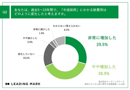 「Q2.あなたは、過去5~10年間で、「中途採用」にかかる総費用はどのように変化したと考えますか。」(n=108)と質問したところ、「非常に増加した」が29.5%、「やや増加した」が38.9%という回答となりました。