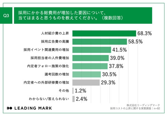 Q1またはQ2で「非常に増加した」「やや増加した」と回答した方に、「Q3.採用にかかる総費用が増加した要因について、当てはまると思うものを教えてください。(複数回答)」(n=82)と質問したところ、「人材紹介費の上昇」が68.3%、「採用広告費の高騰」が58.5%、「採用イベント関連費用の増加」が41.5%という回答となりました。