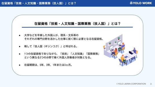 239の国や地域を出身とする30万人以上の在留外国人が登録している日本最大級のメディアを運営する株式会社YOLO JAPAN(代表取締役:加地太祐、大阪本社:大阪市浪速区、以下「YOLO JAPAN」)は、外国人労働者の在留資格の中でも、企業にとって需要の高い在留資格の一つと言える「技能・人文知識・国際業務」について解説した資料を公開しました。