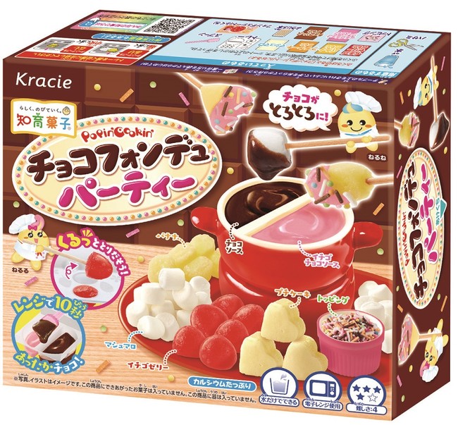 「ポッピンクッキン チョコフォンデュパーティー」は、チョコフォンデュ体験ができるお菓子です。粉と水でイチゴゼリー、バナナ、プチケーキを作り、好きな具材にレンジで温めたチョコソースとイチゴチョコソースをつけて、チョコフォンデュを楽しめます。
