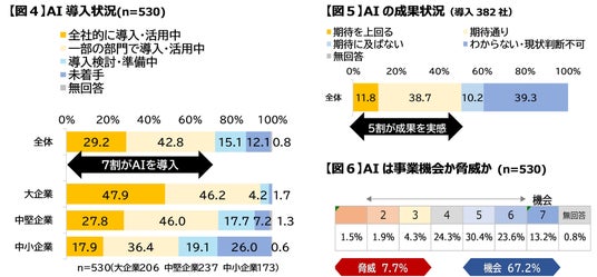 また、7割超が生成AIを導入し、約5割の企業がAI活用の成果を実感するとともに、AI普及を事業機会として捉える企業の7割にのぼります。