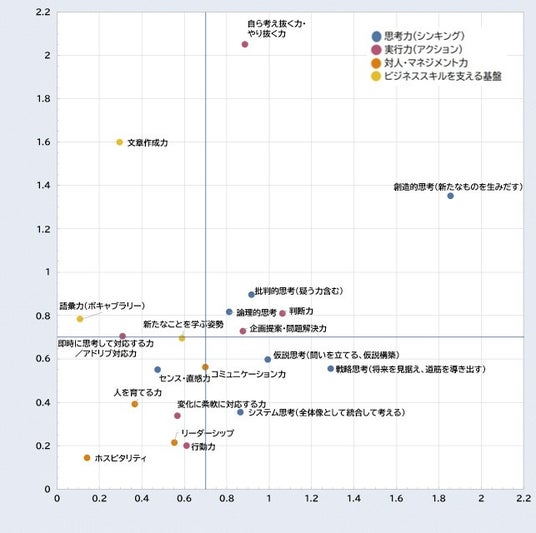 21のビジネススキルについて、縦軸に低下が懸念される能力、横軸に重要性がたかまる能力として、マトリクスで明示すると、「創造的思考」は、重要性の1位、低下懸念の3位、「自ら考え抜く力・やり抜く力」は低下懸念2位、「文章作成力」は低下懸念2位と、この3つが突出していることが明確になりました。