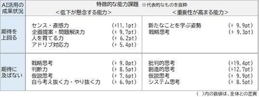 AIを活用したものの成果を感じていない企業では、低下を懸念・重要性が高まる能力ともに「仮説思考」や「批判的思考」などの『思考(シンキング)』関連の項目が多く挙げられています。これは、AIの回答をそのまま利用、うまく活用しきれず、AIを使いこなすための「問う力」「解釈」「調整」する力の不足を課題視していると推察されます。