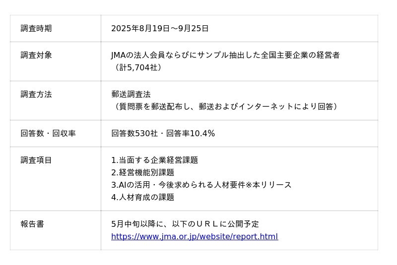 一般社団法人日本能率協会(会長:中村正己、JMA)は、このたび「2025年度(第46回)当面する企業経営課題に関する調査」の結果をまとめました。本調査は、企業が直面する経営課題を明らかにし、今後の経営指針を探ることを目的として1979年から実施しており、今回は530社の経営者(経営管理部門含む)から回答をいただきました。本リリースでは、調査報告第1弾として「AI普及と人材育成」に焦点を当て、調査結果を報告します。