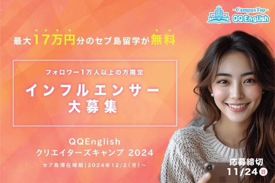 株式会社QQEnglish(本社:東京都渋谷区、代表取締役:藤岡頼光)は、2024年12月にフォロワー1万人以上を持つインフルエンサー向けの特別企画「QQEnglish クリエイターズキャンプ 2024」を開催します。このキャンプでは、最大17万円相当の留学費用が無料、インフルエンサーの皆様にセブ島での語学留学体験と、現地ならではの観光や文化体験を楽しんでいただきます。
