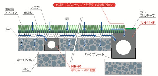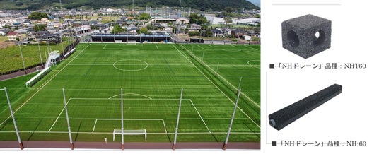 「NHドレーン」は、人工芝グラウンドに必要とされる高い排水性能を有した高速排水材で、グラウンドの表層近くや端に埋設することで、雨水を高速で通しながら、人工芝の素材に多く使用される「プラスチック片」や充填材に使われる「ゴムチップ」などは通しません。グラウンドの水はけを良くするほか、人工芝の破片等の流出を防ぎマイクロプラスチックによる海洋汚染の防止に貢献します。
