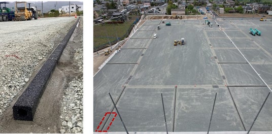 施工時の様子_左:敷設されたNHドレーンの拡大写真(赤点線枠部分の拡大)、右:全景(掘削跡部分にNHドレーンを埋設しています)