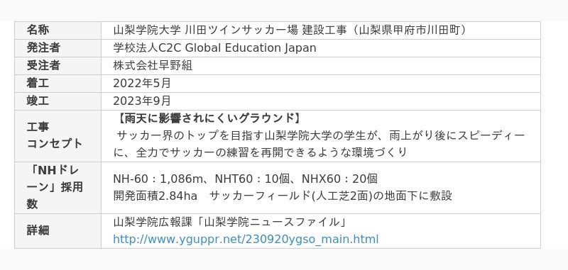 建設DXに取り組む野原グループの株式会社アークノハラ(本社:東京都新宿区、代表取締役社長:岡本力、以下:アークノハラ)は、株式会社早野組(本社:山梨県甲府市、代表取締役社長:早野 正泰)が設計・施工した、学校法人C2C Global Education Japanの「山梨学院大学 川田ツインサッカー場」建設工事(2023年9月竣工)で、人工芝グラウンド用高速排水材「NHドレーン」(以下、「NHドレーン」)を採用いただきました。