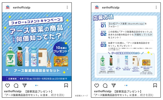 1.【公式】アース製薬(@earthofficialjp)をフォロー。2.6月17日のキャンペーン投稿に「アース製薬商品詰合せセット」に含まれる6個の商品のうち何個知っていたかをコメントしてください。