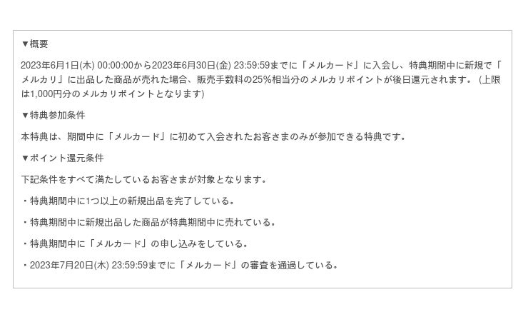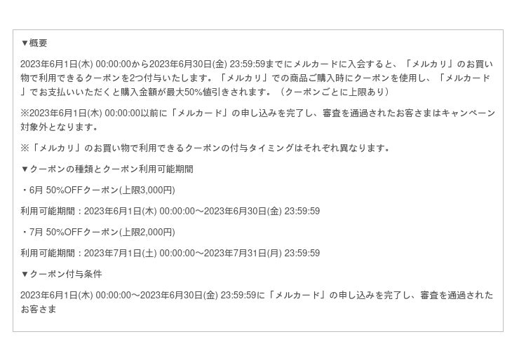 株式会社メルペイは、2023年6月1日より、「メルカード」の新規入会を対象に「メルカリ」でのお買い物が最大半額になるご利用特典(50%OFFクーポン)の提供を開始することをお知らせいたします。さらに、「メルカリ」で出品して売れた際の手数料が25%還元される特典や、「メルカード」の初期設定完了およびお店での支払いで25%還元となる特典とあわせて最大8,000円分がおトクになる特典を提供いたします。