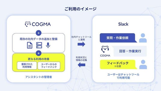 また、COGMA はロボット感がなく、愛着がわくようなサービス設計が特徴です。単なる業務ツールではなく、人間と一緒に働く存在として、ムードメーカーの役割も果たします。これにより、ユーザーは COGMA を単なるツール以上に感じ、COGMA と共に成長していくことができます。