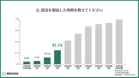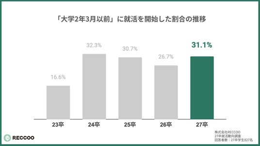 株式会社RECCOO(本社:東京都渋谷区、代表取締役:出谷 昌裕)は、2027年卒業予定の大学生(以下、27卒)827名を対象に、インターンおよび本選考に関する意識調査を実施しました。 調査の結果、24卒から26卒にかけて落ち着きを見せていた「早期化」の波が27卒で再び加速に転じている実態が明らかになりました。