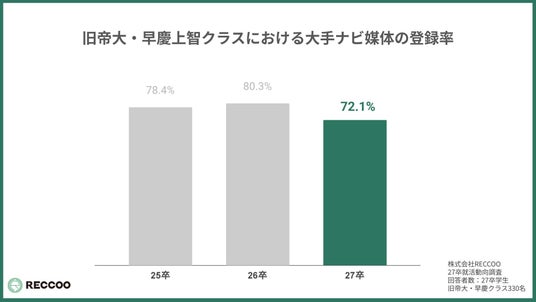 しかし、メディア活用が続く一方で、旧帝大・早慶上智クラスの大手ナビサイト登録率は72.1%まで低下し、過去3年で最低を記録。前年の80.3%からわずか1年で8.2ptもの急落を見せています。