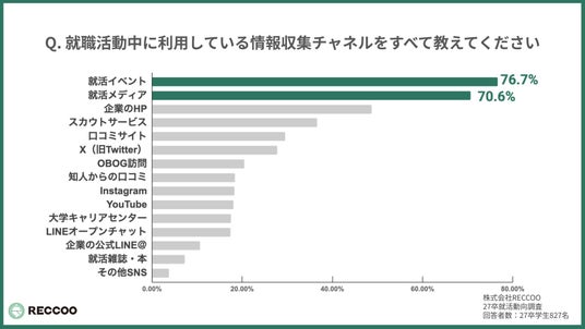 情報収集源の1位は「就活イベント(76.7%)」、2位は「就活メディア(70.6%)」が占め、効率的に情報を得られるチャネルが支持されています。