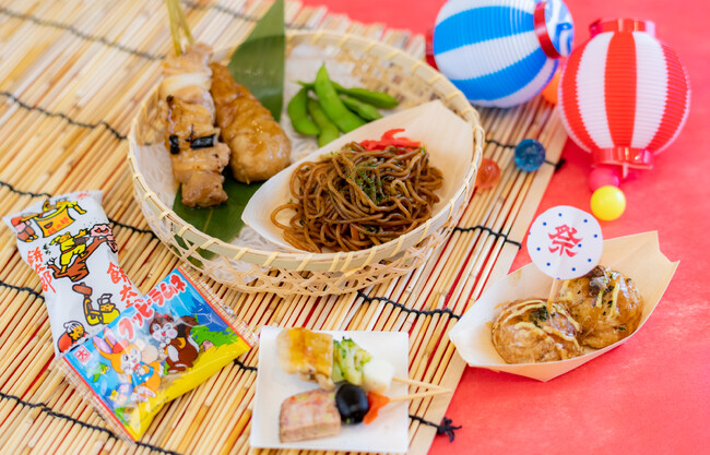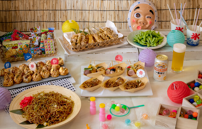 5種のソースで焼き上げた香ばしい味わいの焼きそば、とろ~り食感で食べ応え十分な大玉たこ焼き、炭火焼きの本格焼きとり3種盛り合わせなど、ビールがすすむ人気の屋台メニューに、懐かしの駄菓子セットやお祭り風装飾グッズなどお祭り気分を盛り上げるセットを期間限定でご用意しました。全国に宅配便でお届けするので、オフィスはもちろん自宅や野外でも場所を選ばず盛り上がること間違いなしです。