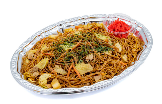 5種のソースを組み合わせて焼き上げた、屋台で食べるような香ばしさのある焼きそばです。かつお粉末をふりかけ、鰹節特有の香りと旨味をプラス。モチモチとしたコシのある伸びにくい麺を使用しており、時間が経ってもおいしく召し上がれます。