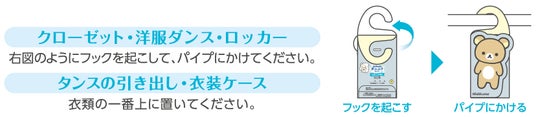 「アロマ香る ダニよけサシェ」は、衣類の収納空間にかけるだけで、ダニ※1を寄せつけにくくする商品です。また、消臭成分配合で、収納空間にこもったニオイ※2を消臭します。クローゼットや洋服ダンスのパイプに本体のフックをかけるだけ、引き出しにはそのまま入れるだけで簡単にご使用いただけます。