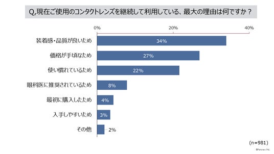 3.現在使用中のコンタクトレンズを継続して利用している最大の理由は「装着感・品質が良いため」34%