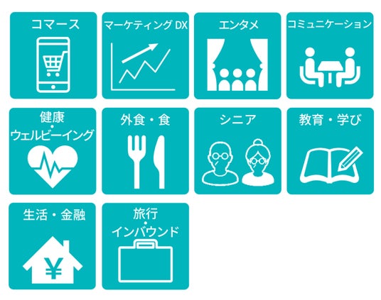 今回取り上げる100社は、「コマース(7社)」「マーケティングDX(13社)」「エンタメ(14社)」「コミュニケーション(7社)」「健康・ウェルビーイング(8社)」「外食・食(11社)」「シニア(7社)」「教育・学び(8社)」「生活・金融(16社)」「旅行・インバウンド(9社)」の、成長が期待される10の分野の有望企業です。