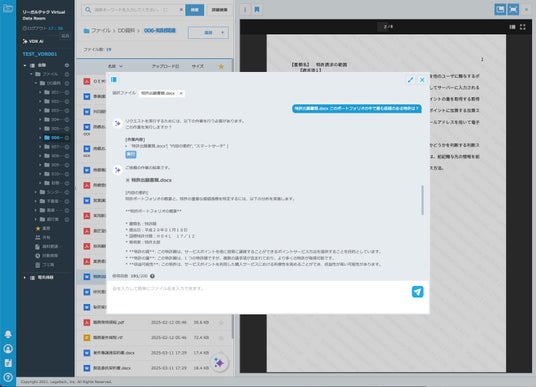 2025年3月12日 リーガルテック株式会社(本社:東京都、代表取締役:佐々木 隆仁)は、バーチャルデータルーム(VDR)「リーガルテックVDR」に、大規模言語モデル(LLM)を活用した生成AI「AI孔明」を統合したことを発表いたします。本統合により、弁理士が日常的に直面する特許調査、契約審査、リスク管理、訴訟対応などの多様な業務を劇的に効率化し、弁理士の専門性が求められる高度な戦略立案やクライアントへの価値提供に集中できる環境を提供します。