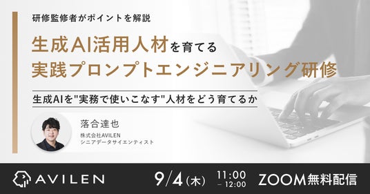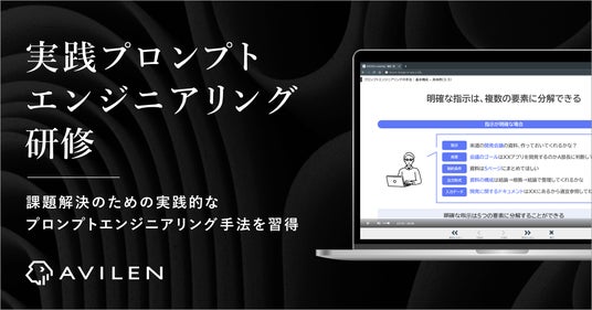株式会社AVILEN(本社:東京都中央区、代表取締役:高橋 光太郎、以下「AVILEN」)は、法人向けeラーニング形式の「実践プロンプトエンジニアリング研修」の提供を開始しました。本研修は、業務における生成AIの活用方法を体系的に学び、自らの業務に応用できるスキルを実践的に習得できる内容です。