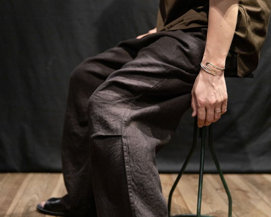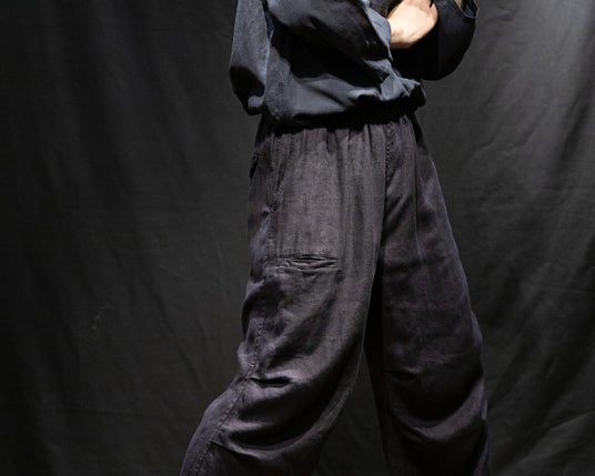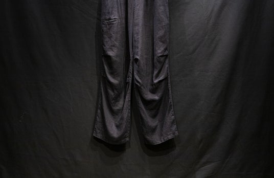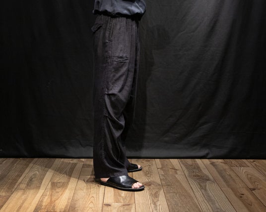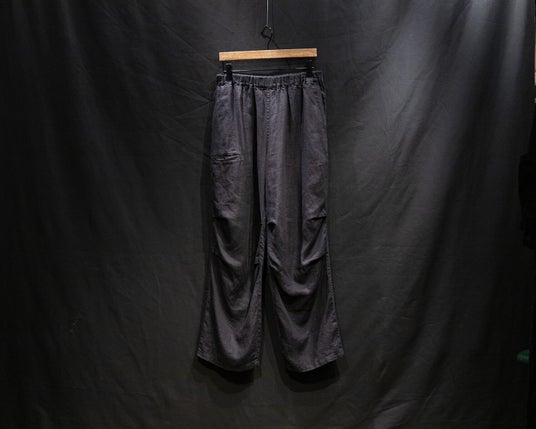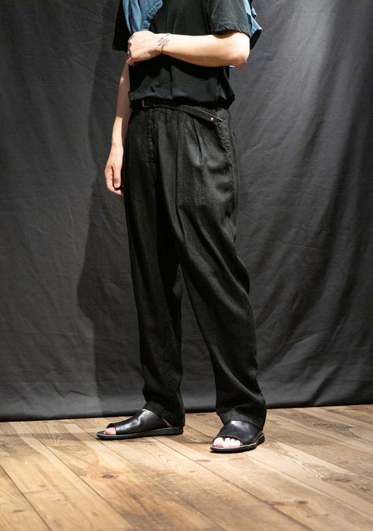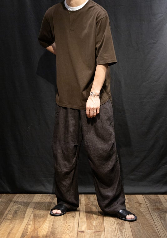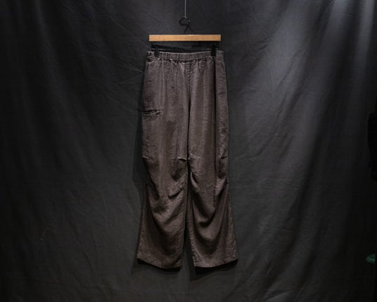 4年目となるリネンアムンゼン、今季は2型。1型は2021年に初代としてデビューしたミリタリーパンツを復刻。もう1型は、内向きに大きく摘まんだテーパードイージートラウザーズ。