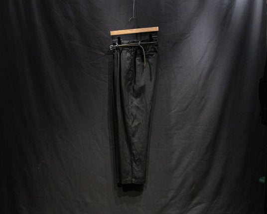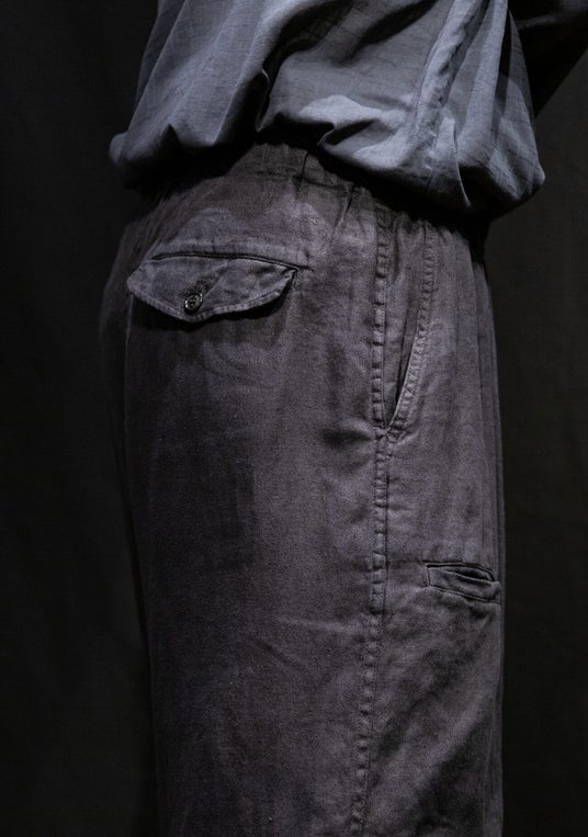 リネンアムンゼン初代モデルの復刻となる膝プリーツの入ったミリタリーオーバーパンツ、パラシュートパンツを思わす一本。CONFECTではお馴染みとなる夏季の濃色製品染め