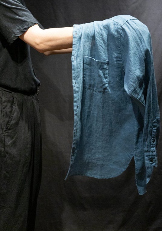 細番手糸のリネン100%素材は、リネン本来の機能性を存分に発揮。吸放湿により肌にベタつかず、風が抜ける。また、綺麗な毛織物が由来となるアムンゼン組織に織ることで下向きに流れる見事なドレープが生まれ上品な艶が活かされます。見た目ほどの重たさのない、リラックスした着心地を実現します。