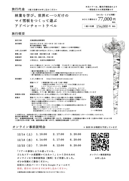 本ツアーは、厚真町への誘客促進を目的に、スノーサーフィン文化と林業をかけ合わせた、「雪板」づくりワークショップという厚真町ならではの体験型コンテンツとして企画し販売するものです。