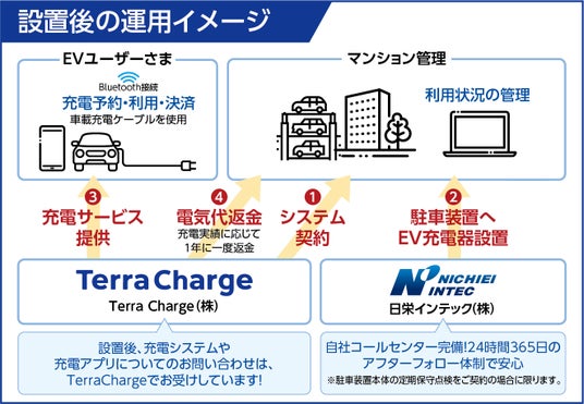 電気自動車(EV)向け充電サービス「テラチャージ」を展開するTerra Charge 株式会社(本社:東京都港区、代表取締役社長:徳重徹、以下「当社」)は、日栄インテック株式会社(本社:東京都荒川区、代表取締役:西川嘉俊、以下「日栄インテック」)と連携し、日栄インテックの機械式駐車装置にテラチャージの通信機器を組み込む駐車装置用EV充電器の提供を開始しましたことをお知らせいたします。