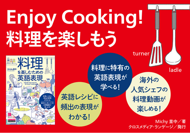 語学書を出版する株式会社クロスメディア・ランゲージ(東京・渋谷区、代表取締役・小野田幸子)は、2023年2月1日に書籍『料理を楽しむための英語表現』を刊行します。昨今SNSを通して英語のレシピを見ることが多くなりました。作ってみたいと思っても、単語のニュアンスの違いや計量の単位の違いに戸惑ってしまうことがありませんか? 本書は、海外の料理番組や英語レシピに出てくる英語表現を知りたい!という方のための英語学習書です。料理に関する英語をさまざまな角度から楽しく解説します。海外の人気シェフやパティシエのレシピに挑戦してみましょう!