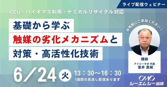 化学・ファインケミカル分野などの技術・市場動向レポート発行やセミナー開催を行う、株式会社シーエムシー出版は、6月24日(火)に「触媒の劣化メカニズムと対策・高活性化技術~CCU・バイオマス利用・ケミカルリサイクル対応~」セミナーをライブ配信にて開催します。