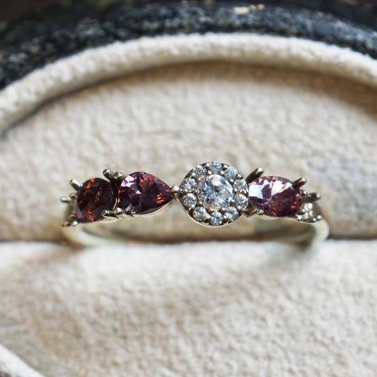 一般的に赤のイメージが強いガーネットですが、オレンジやグリーン、パープルなど、産地や成分の違いによってさまざまな色合いが存在します。色の違いによって印象も大きく変わり、落ち着いた表情から軽やかな発色まで、それぞれに個性があります。