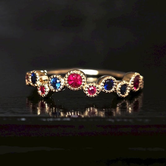宝石には、発色と透明感に優れたスリランカ産ブルーサファイアと、深紅から澄んだ赤まで幅のある色調を持つモザンビーク産ルビーを使用しています。サイズや色味を均一に揃えず、一石ずつ選定することで、それぞれの個性が引き立つ構成としました。