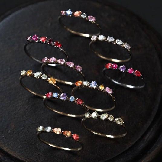 「新春リング」は、ラウンドやペアシェイプなど、異なる表情を持つ宝石を横一列に5石配したリングです。石を覆いすぎない軽やかなセッティングとすることで、それぞれの色や輝きをまっすぐに感じられる構造に仕立てています。指の幅ほどに連なる構成でありながら、装いに自然となじむバランスを意識しました。