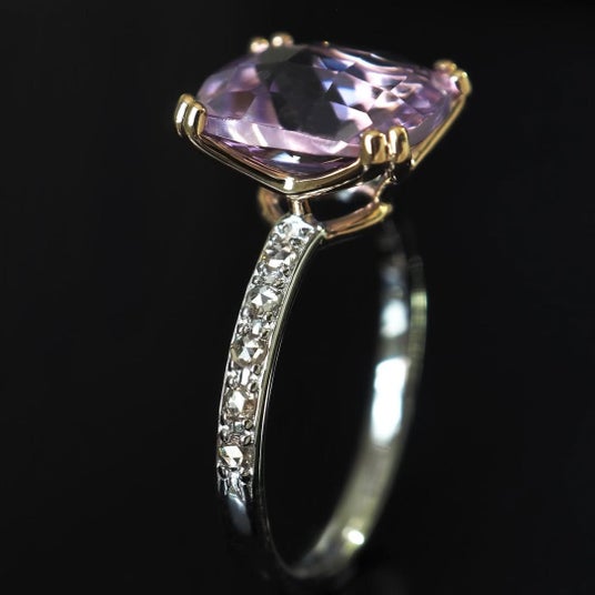 ムーンストーン、ガーネット、シトリン、カーネリアン、ローズアメシストなど、宝石ごとの光の表情を重視して選定しました。アームにはシルバーを用い、クラシカルな佇まいと軽やかな着け心地を両立しています。センターストーンに呼応するよう、イエローやスチールグレー、ローズカットのダイヤモンドを添えた構成も見どころです。