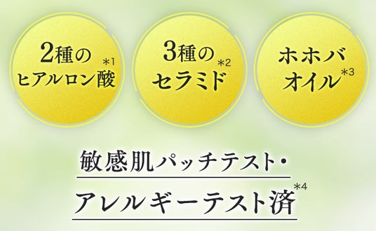 *¹ヒアルロン酸ドロキシプロビルトリモニウム、加水分解ヒアルロン酸 (全て整肌) *² Nーステアロイルジヒドロスフィンゴシン、Nーステアロイルフィトスフインゴシン、ヒドロキシステアリルフィトスフィンゴシン(全て整肌) *³整肌 *4全ての方に皮膚刺激・アレルギーが起こらないということではありません。